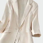 Elegantní sako s nadčasovým střihem a moderním designem. Má klopu, přední zapínání na jeden knoflík a dlouhé rukávy se zdobnými knoflíky na konci. Jeho rovný střih ho činí ideálním jak pro pracovní příležitosti, tak pro volnější chvíle. Kousek, který dodává styl a šarm každému outfitu.
