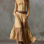 Jejich zúžený živůtek s kovovými knoflíky zvýrazňuje siluetu, zatímco splývavá sukně s patchworkem dodává dynamiku a půvab s každým krokem. Šaty navržené pro ženy s volným duchem a citem pro jedinečnost.